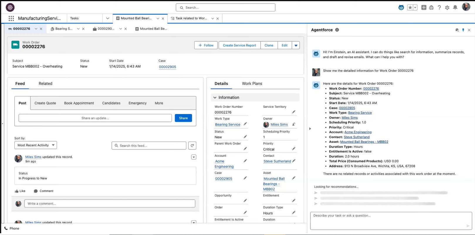 With Contextual Asset Insights in Salesforce Field Service, Agentforce surfaces real-time asset data, maintenance history, prior cases, and warranty details the moment a work order is opened.