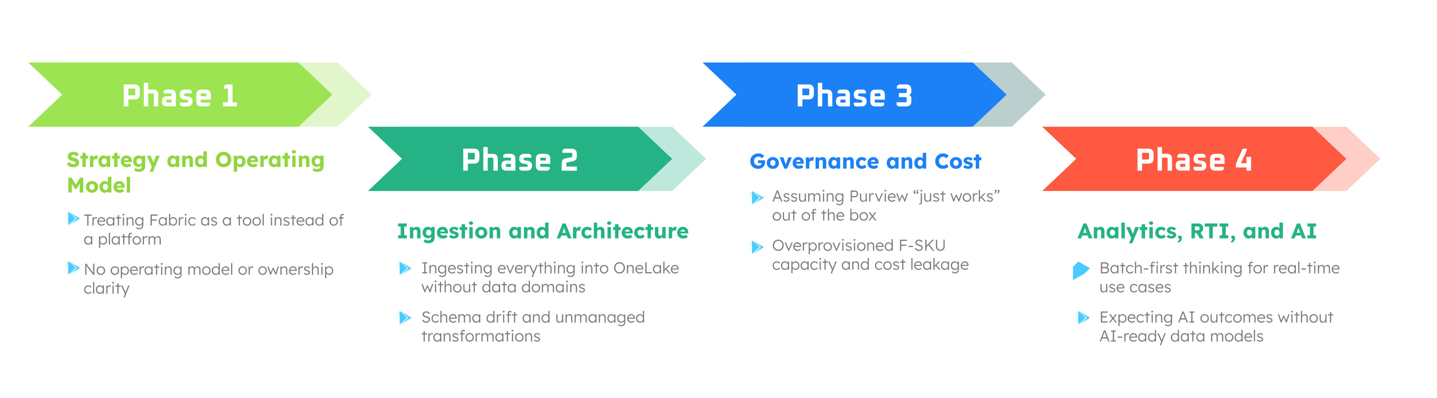 | Treating Microsoft Fabric as a point solution. | Recreated data silos, fragmented ownership, low platform adoption, and limited cross-team collaboration. | Define a unified Fabric operating model with shared ownership across data engineering, BI, governance, and operations. |
