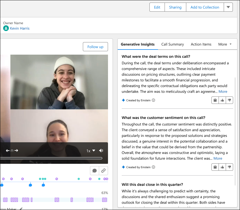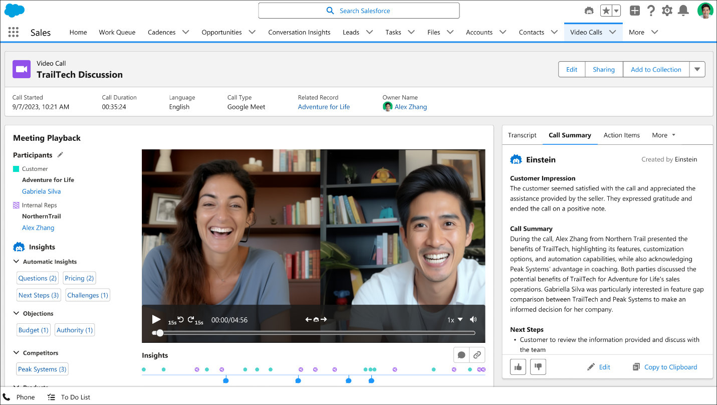 Where: This feature requires Einstein Conversation Insights and is available in Lightning Experience in Enterprise, Performance, Unlimited, and Agentforce 1 Sales editions. Einstein generative AI is available in Lightning Experience.