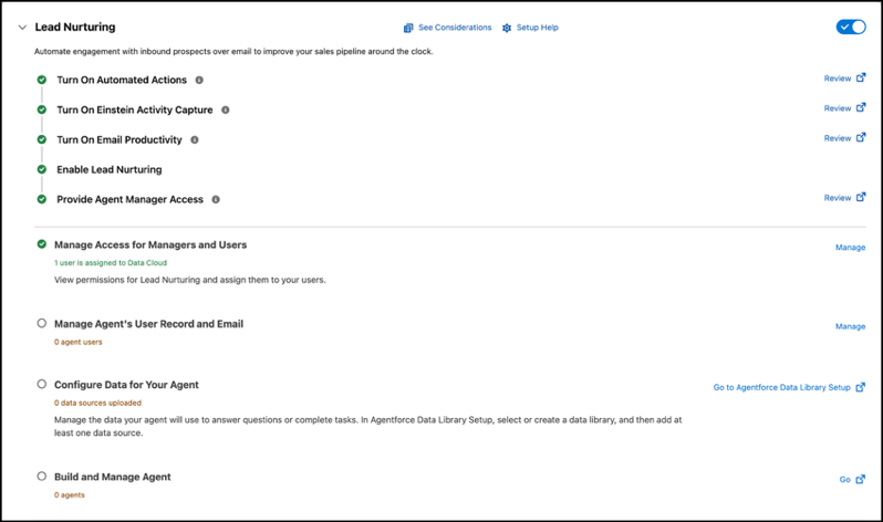 When you’re ready to create a Lead Nurturing agent, the new guided setup experience in Salesforce Go saves you time and simplifies the process by automating several steps.