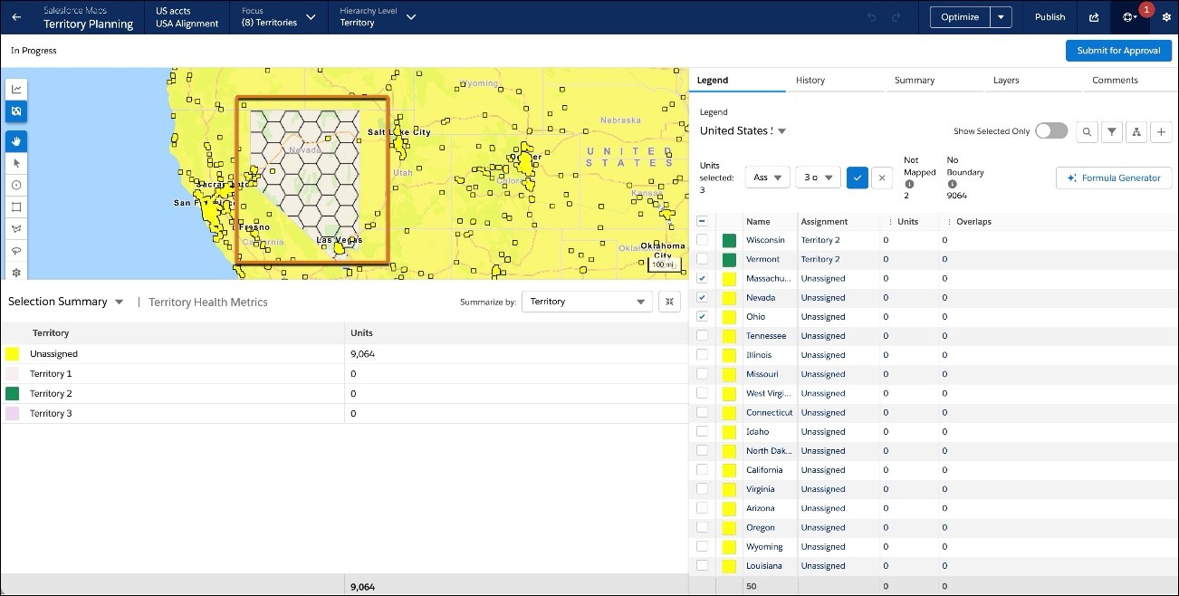 Distribute top-down financial targets directly to accounts within Territory Planning. You can split targets evenly, weight them based on criteria like annual revenue, or distribute by defined segments. To ensure realistic planning, the allocation logic respects existing bottom-up targets set by the field. This alignment simplifies the transition from territory design to quota planning.