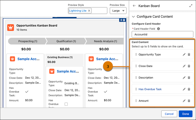 We added the Opportunity Type, Closed Date, Description, Has Overview Task, and Amount fields to the card content (3).