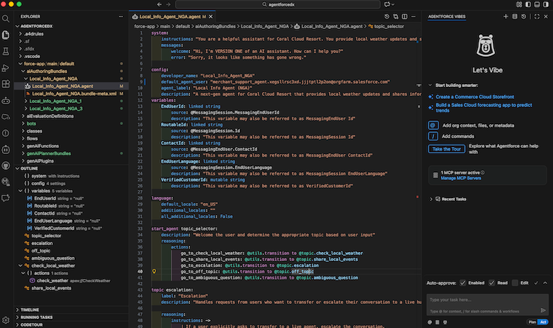 Then use the VS Code editor to customize the agent by coding its Agent Script file, which is the agent’s blueprint. You can also vibe code the Agent Script file by using Agentforce Vibes.